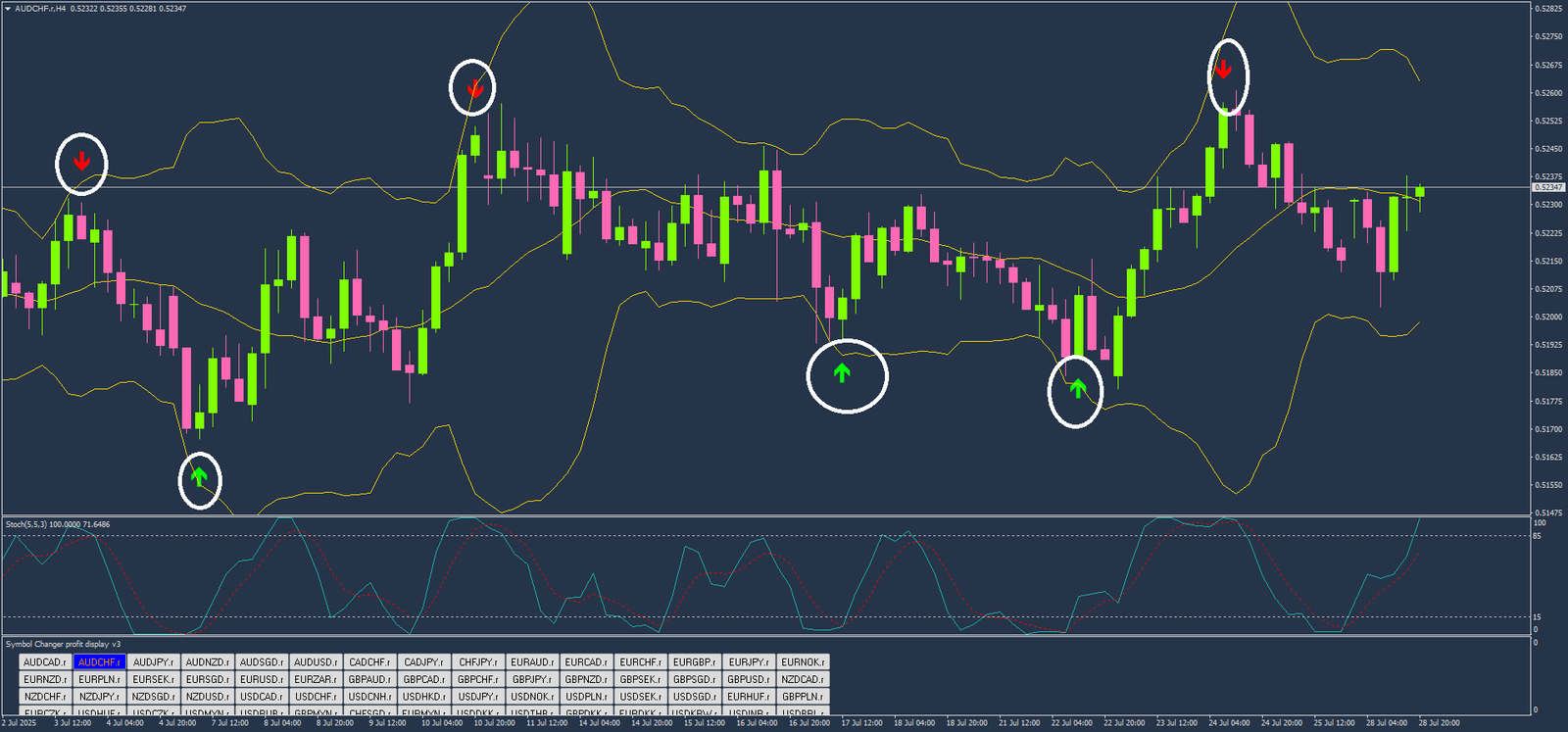 Para compras, se a seta inicial falhar, espere que a linha %K do Estocástico cruze novamente acima da linha %D, ainda na zona de oversold (abaixo de 20), para considerar uma nova entrada. O mesmo se aplica para vendas: re-entrada apenas com um novo cruzamento da %K abaixo da %D na zona de overbought. Use isso com parcimônia; se a re-entrada falhar, o mercado provavelmente não está pronto para reverter e é hora de sair.